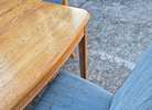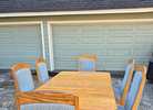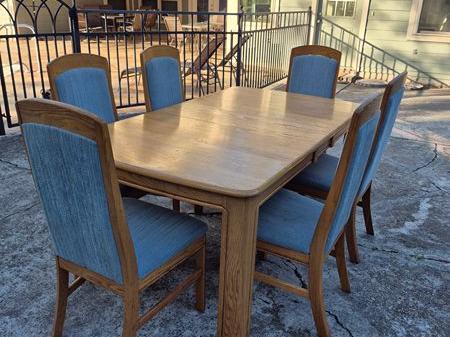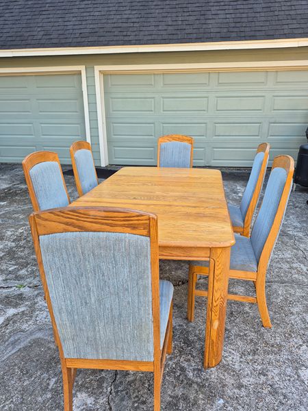 Dining table with 6 chairs. Table has scratches and wear. Chairs need to be cleaned.