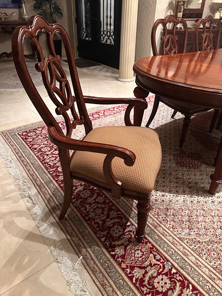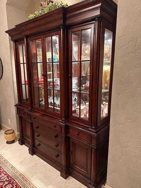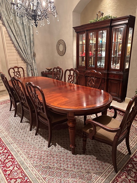 Elegant Thomasville Dinning set well maintained. Clean . Dinning table eight chairs including two arm chairs and stunning lighted china cabinet / Hutch. Table has 2 expansion leaves. Available for immediate sale .