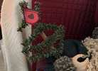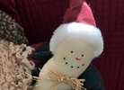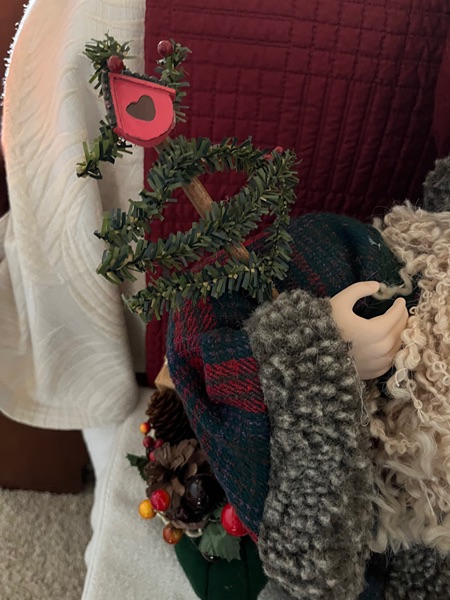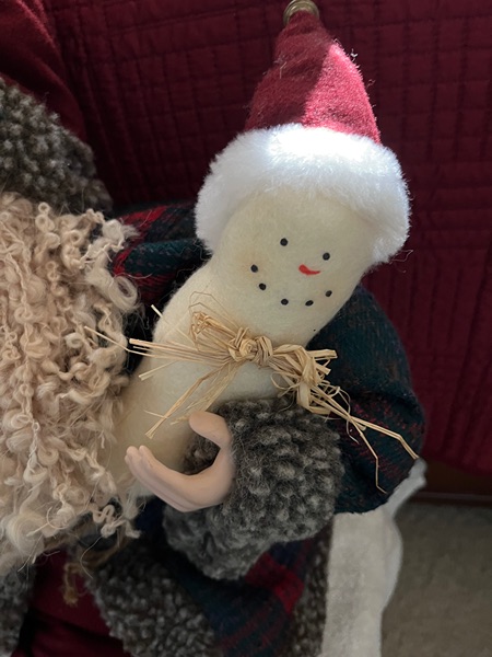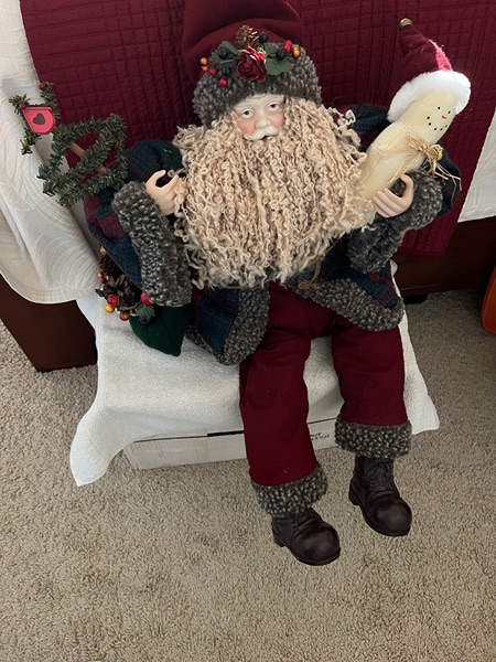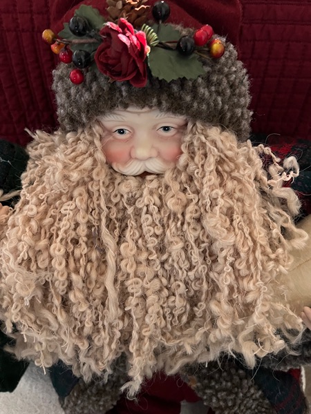 Wonderful Stuffed Sitting Santa - fabric clothing, porcelain face and hands. Fabulous details! Please see all of the pictures for the details. Santa needs a new home due to downsizing. From smoke-free environment.