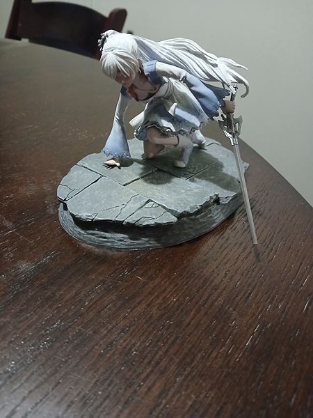 Detailed anime character figurine on a stone base. Weiss Schnee RWBY