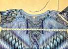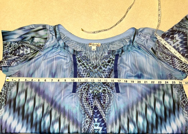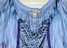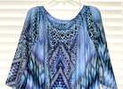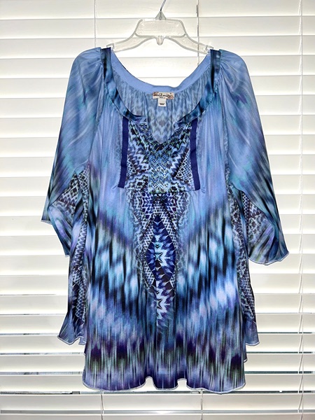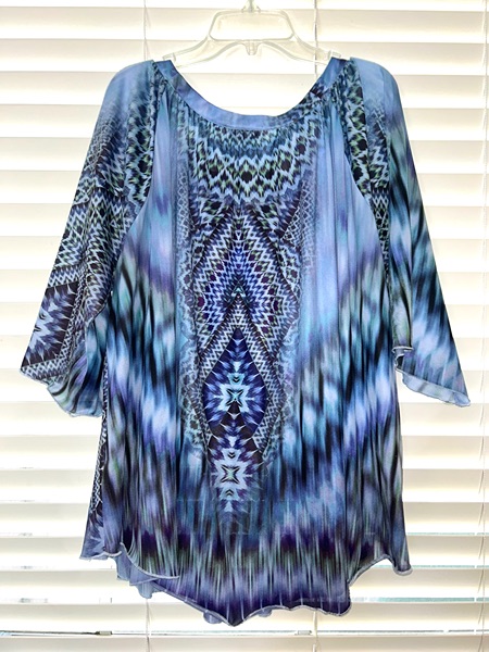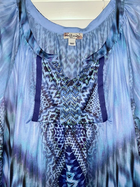 This is a World Unity women's blue multicolor blouse with a bohemian abstract pattern and sequin accents. It's lightweight, size 1x, in very good condition from smoke free home. It's a little hard to get an exact pit to pit measurement because it's a flowy material. $8