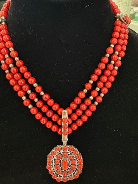 This is a genuine Coral Beaded necklace.  Purchased this in 8/3/03. Never worn.  Mounted in Sterling Silver.  The clasp is Sterling Silver.  Matching earrings are pierced.