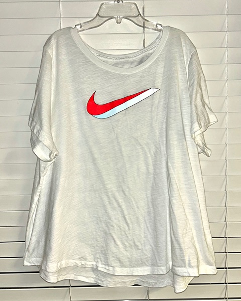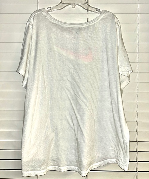 Scoop neck, short sleeves, 100% cotton, size 2X lightweight women's tee. Left underarm has a small spot that's missing a stitch or two (pictured). Otherwise, good condition from smoke free home. $3