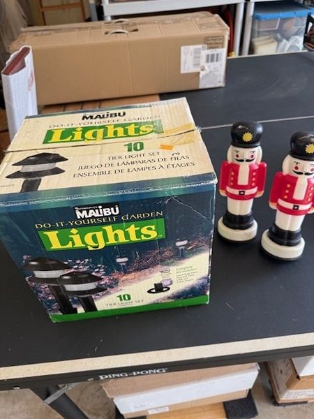New in box Malibu landscape lights set - 10 lights. Includes transformer, wire and lights. Also included are 10 vintage plastic Christmas soldiers that fit these for outdoor Christmas holiday cheer! . $50 firm for both the lights and solders.