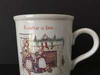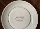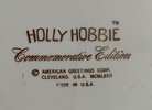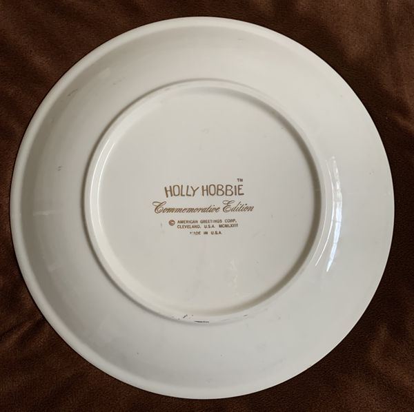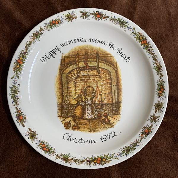 Small girl wraps her arm around her cat as they warm themselves in front of the fireplace; three stockings hang from the mantle. “Happy Memories warm the Heart” Cream stoneware with decorative border;10¼” diameter; made in USA; Commemorative Edition; American Greetings.