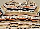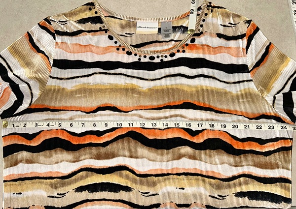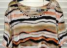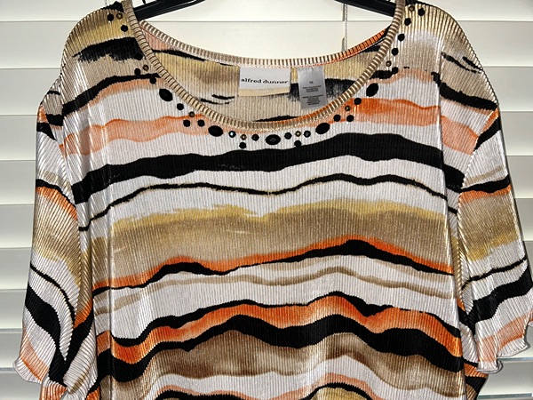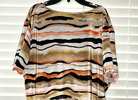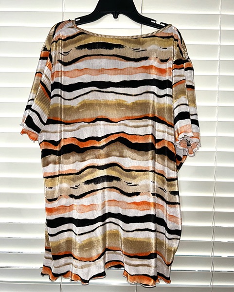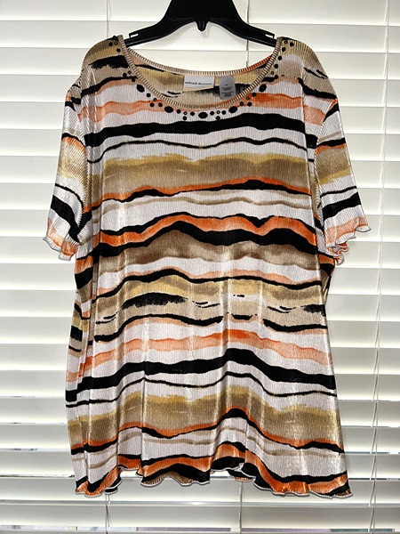 Brand is alfred dunner, size 1x, 100% polyester. This short sleeve blouse features a wavy, striped pattern in tan, orange, black in white hues. It's flowy, lightweight material with a silky feel and features bead embellishments around the neck. Very good condition from smoke free home. $6