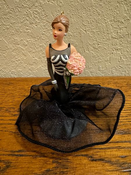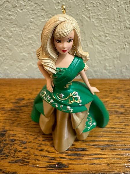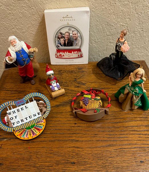 In order of pictures: Barbie in black * '40 Years of Fashion 1959 - 1999' $10.00 **** Barbie in green * Celebration Barbie Special 2011 Edition inspired by Holiday Barbie Doll $10.00 **** 2001 Santa Claus $10.00 **** Snow Globe Our Family 2012 Picture Holder $10.00 **** 1998 Maxine & Floyd $5.00 **** 1995 Wheel of Fortune $10.00 **** 1991 Chrstmas Welcome $5.00