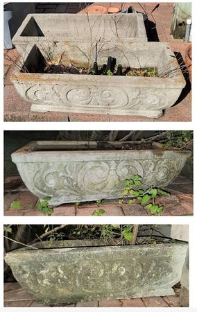(4) Vintage-30' Fleur-de-lis Cast Stone Planters. (2) need cleaning. Roughly 30' Long x 14' Wide x 10' Tall. Beautiful addition to any garden/yard. Pick Up Only. No Delivery Available.