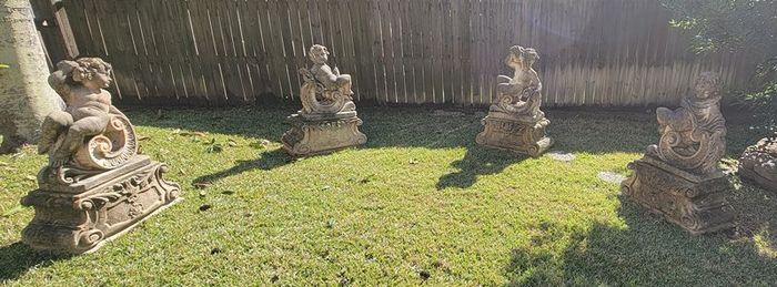 (4) Cast Stone Cherub Statues. Each depict one of the Four Seasons.Each statue is roughly 45' Tall (w/base) x 32' Long x 16' Wide. Comparable price $1500 w/out bases. Truly beautiful-These statues add a level of elegance and serenity to any garden yard. Will need to be picked up. Delivery not available.