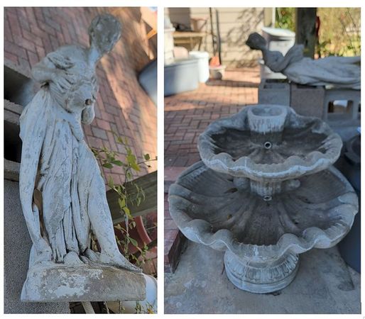 Vintage-Grecian Statue (2 Piece) 2 Tiered Fountain. Roughly 66' Height when fully assembled with statue. Largest basin is roughly 36' x 36'. Beautiful and elegant addition to any outdoor garden. Pick Up only. Delivery Not Available.