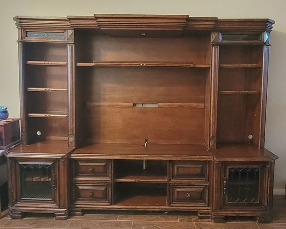 Vintage-Aspen Home Entertainment Center. Solid wood with leaded window cabinets and adjustable shelves. Beautiful addition to any home. Measures roughly: 107' Long x 78' Tall x 24' Wide. Comes apart for easy move and reassemble. Pick Up Only. No Delivery Available.