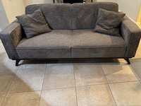 In the color dove gray. Performance fabric. No rips or stains. Very clean. Deep seating. Normal wear