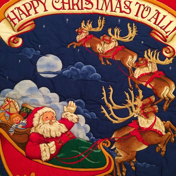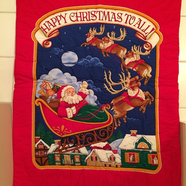 This preprinted piece can be used as a baby quilt or as a wall hanging. It is 36' long and 28 1/2' wide. It has been machine stitched to give depth. There is a red ribbon on the back if you want to hang it.
