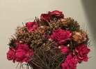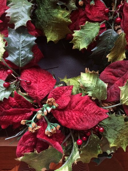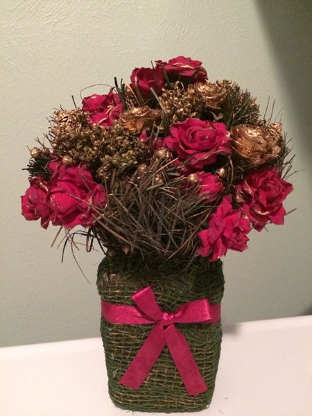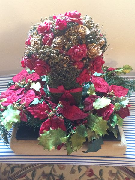 The topiary is 12' tall and the flowers extend out to about 9'- it has gold and burgundy roses and is tied with a burgundy ribbon on the bottom. The base is 5' tall and 3 1/2' wide. I used to put it inside the poinsettia ring that is pictured. The ring is 19' from one end to the other end of the greenery. The inside circle is 7' - perfect for the topiary or if so desired a candle. I will sell them separately if so desired. Asking $15 for each or $25 for the set.
