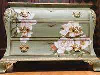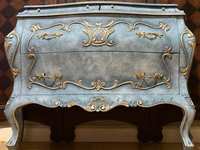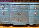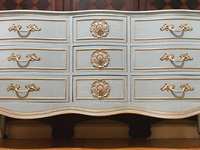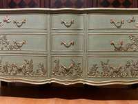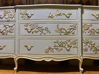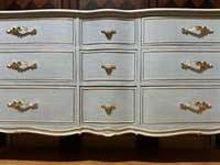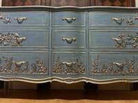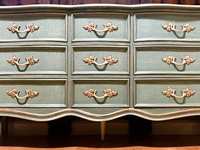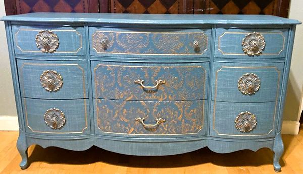 - We cleaned, filled, sanded, primed, added worn linen texture paint and glazed in layers. We hand poured molds for backplates on the outer drawers and found some really pretty vintage handles for the front bottom drawers. Then we added raised stencil designn on the front and guilded it and used the same stencil for the sides unguilded, then sealed for durability.
