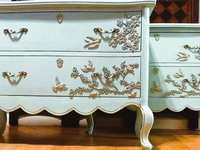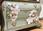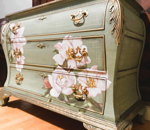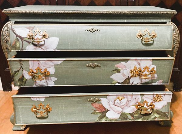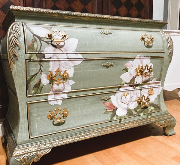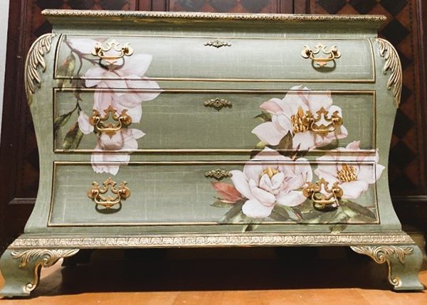 - We cleaned, filled, sanded, primed, texturized with a gorgeous hand applied linen technique in multiple layers, gilded, added Beautiful magnoia blooms for a welcoming, high end design. We then gilded and sealed entire piece with polycrylic for durability.