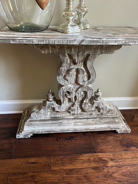 Add character and charm to your home with this beautifully carved wooden entry table. The intricate base design and distressed whitewashed finish give it a rustic, vintage feel that works perfectly in farmhouse, French country, or eclectic décor styles.