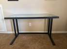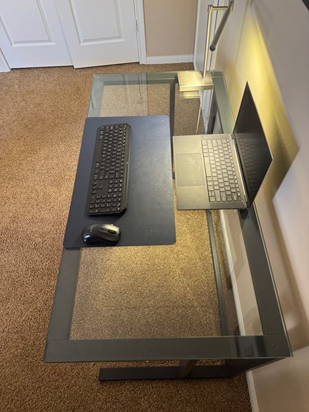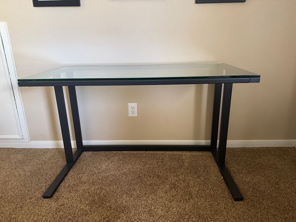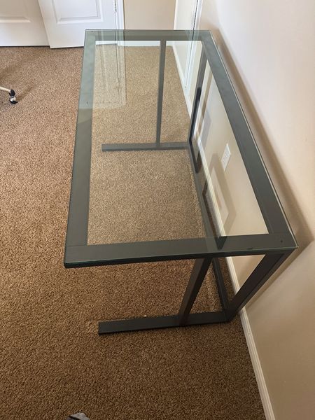 For sale: A sleek and modern desk from Crate and Barrel, featuring a sturdy metal frame and a clear glass top. With dimensions of 48” wide, 24” deep, and 29.5” high, this desk offers ample workspace while maintaining a minimalist, contemporary design. Perfect for home offices, studies, or any modern space, it combines style and functionality. Gently used and in excellent condition.