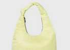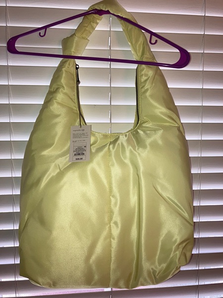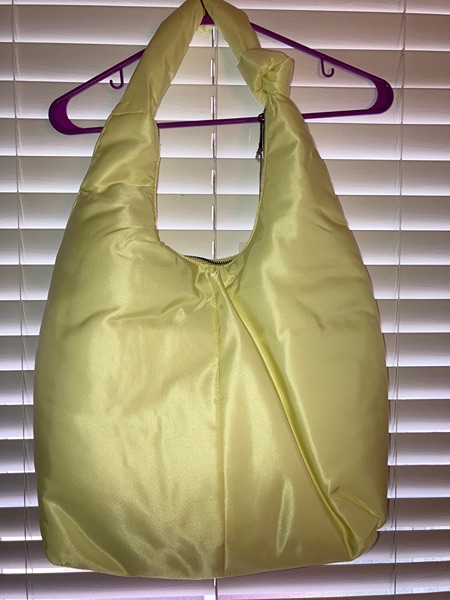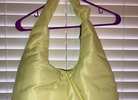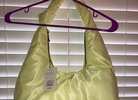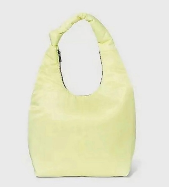 A large knotted puffer bag in lime yellow from brand A New Day. This single handle shoulder bag has zip closure, is made with recycled polyester, is super soft, and has a spacious main compartment with zip pocket. It measures approximately 23.5 inches tall from top of handle to purse bottom x 17 inches across left to right x 7 inches deep front to back. New with tags from smoke free home. $5