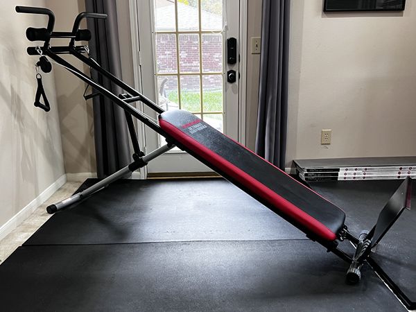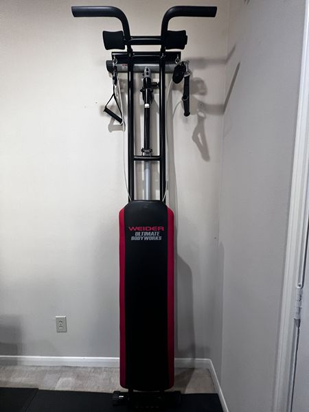 Like-new Weider Ultimate Body Works home gym. Adjustable incline bench with cable/pulley system (similar to a Total Gym).