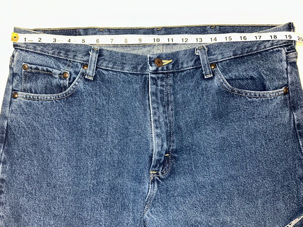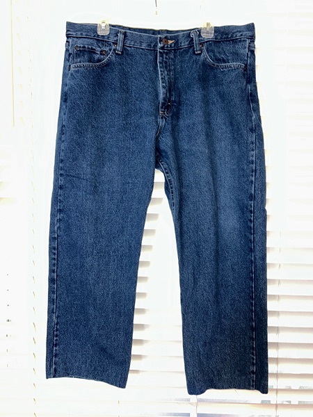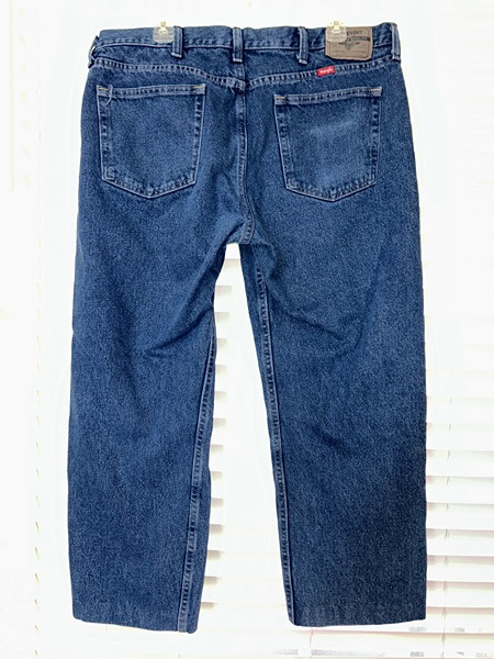 Wrangler men's jeans with 5 pocket design, zip/button closure, straight legs. The length has been shortened and the inseam is about 26.5 inches. There are no holes or stains, but you can see a wallet outline on the back right pocket. I can't find any tags, so I'm unsure of the exact style and waist size. They look to be about 38 x 26.5. I've provided pics with measurements and priced accordingly. Smoke free home. $4