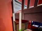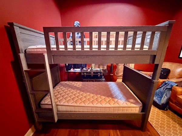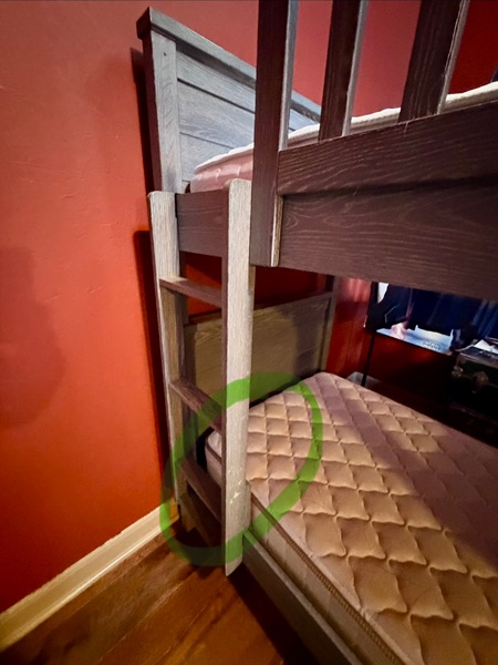Gently used Pottery Barn Camp bunkbed twin over double bed. Minor blemishes on ladder and inside top headboard. Top headboard had safety sticker on it that didn't get removed all the way. Ladder may also be sticker residue. See photos.