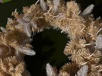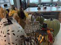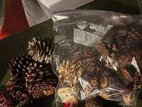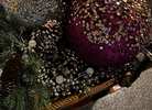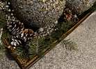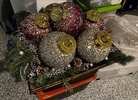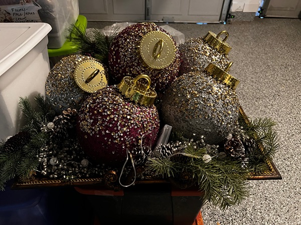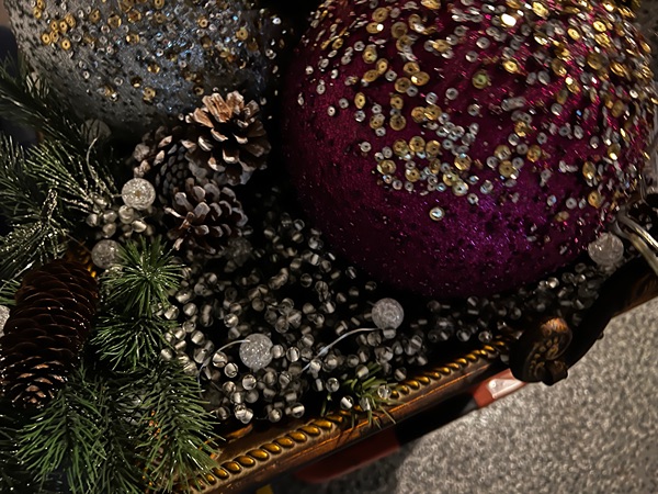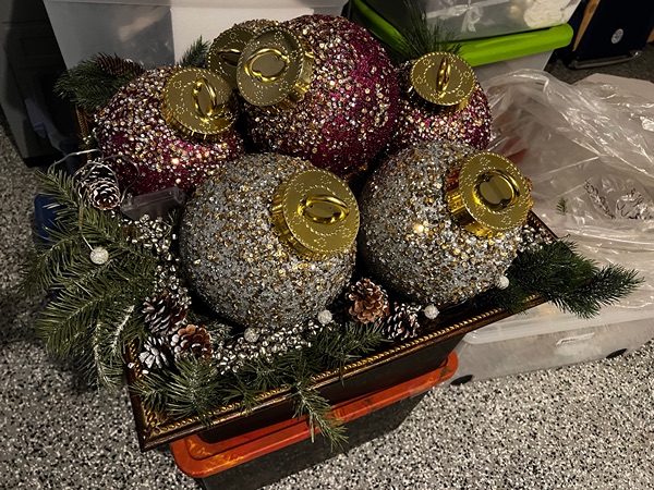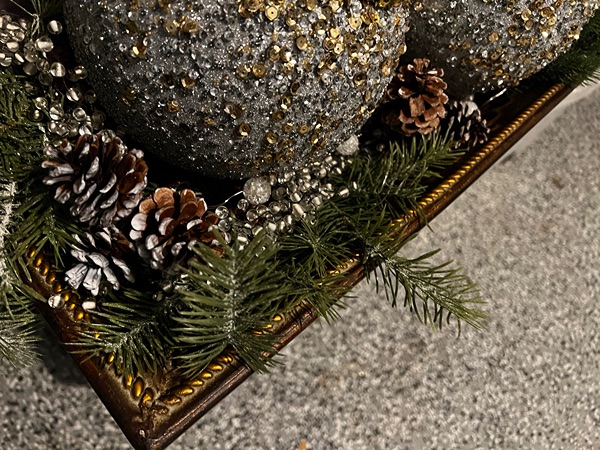 Holiday centerpiece including 6 large jeweled ornaments, beaded garland, pine cone fillers & light string nestled in a metal 24" x 24" embossed metal tray. Cash please