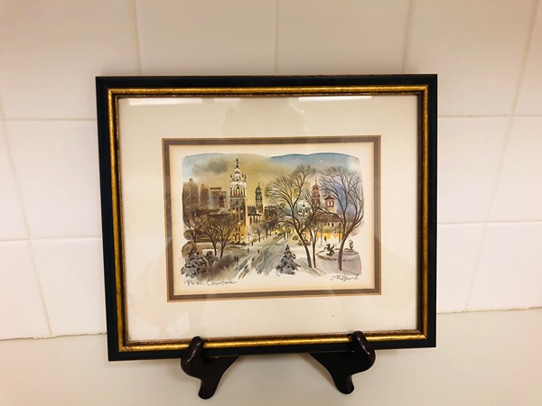 Wintry look at the Country Club Plaza in Kansas City. Measures 9 x 11 inches. Gold rimmed frame. Very good condition. Asking $10.00.