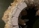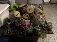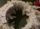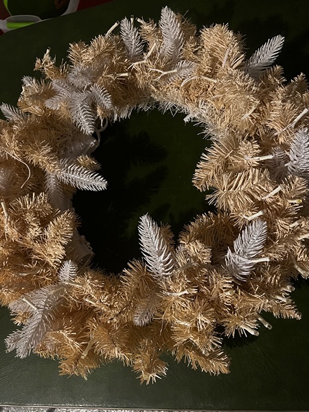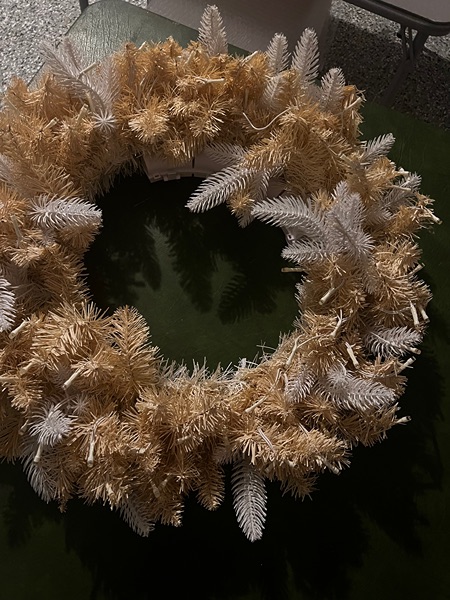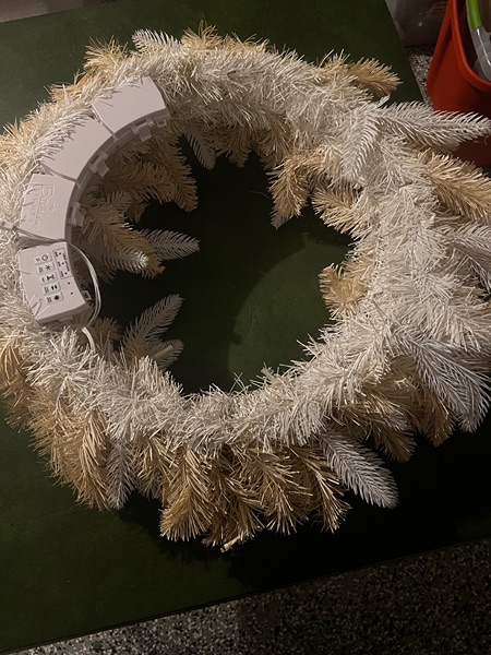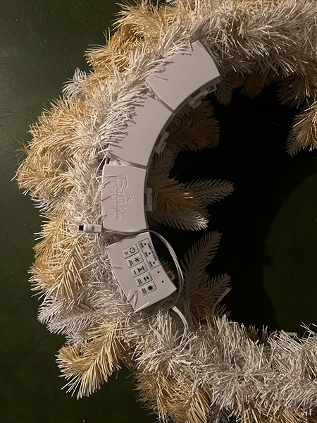 White & natural lighted door wreath. Width branch to branch 24". Width wire to wire 15". Takes 6 D cell batteries. Choices include showing all white lights or multi colored. Selection available for functions, steady, blinking, etc. Has timer mode. Cash please