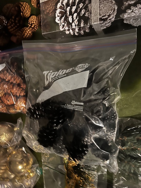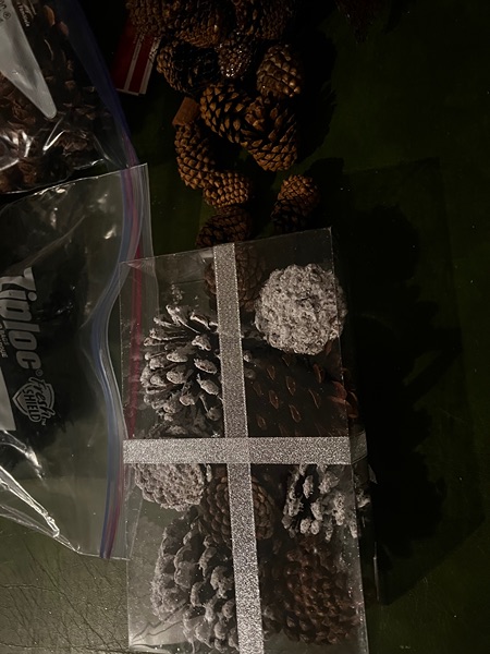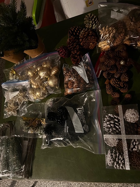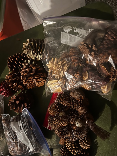 Charming collection of decorative pine cone & fillers. Use alone or as part of a decorative setting. Also stair banister ties for attaching garland. Cash please
