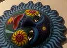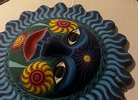 Colorful sun wall art. Vibrant blues. Clay like ceramic material
