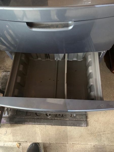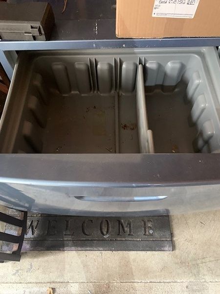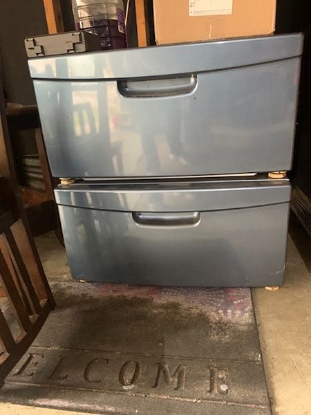 Solid, well‑made metal storage bins with smooth‑sliding drawers. Light surface scratches from normal use, but no dents and fully functional. Designed to stack securely, and strong enough to support additional items on top.