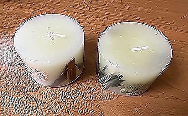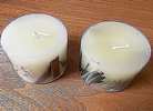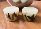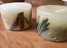 Candles are new and smell lovely but I don’t remember the name (I’d guess maybe Magnolia, Eucalyptus and a tad of Vanilla). About 2 1/2” diameter x 2” tall…$10 total, firm