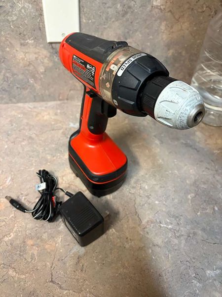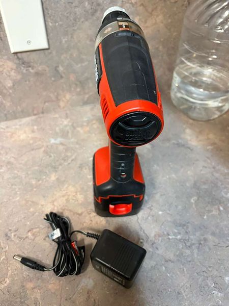 Used Black & Decker drill, comes with charger and battery. Model: BD12PS Type 1 12V DC. 1200 RPM High Speed.