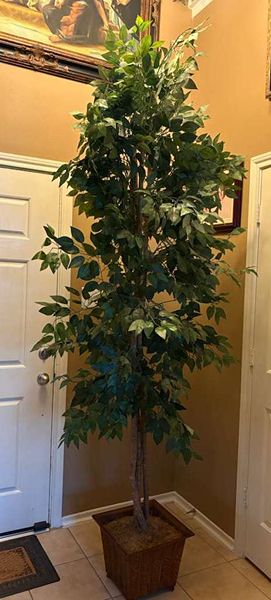 Tall & Robust Artificial Ficus tree with Pot Practically new. Measures; Height: 98” height, width 39”. Pot height 11” x 14” In Great condition no smoke or pets odors.