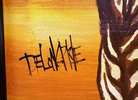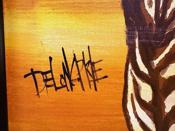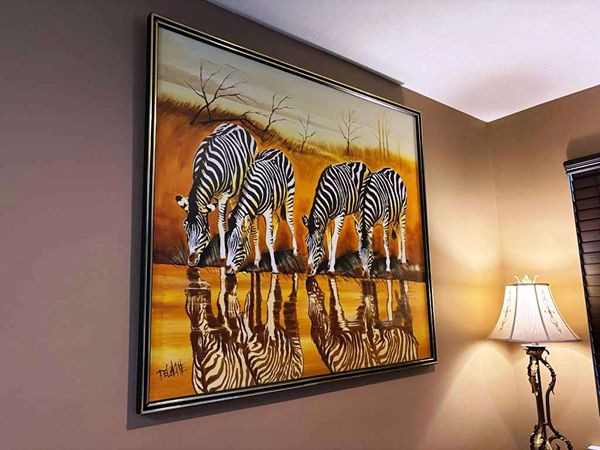 Huge Spectacular colorfull hyperrealist oil painting signed by author dating from the mid-1960s. Measurements: Height 50” (inches) Width 56” (inches) Frame width 1.5”. Its author is Delonapre whose signature is inscribed in the lower left corner of the painting. As the work resembles the reflection of the zebras in the water is undoubtedly an effect of realism and at the same time the captured morphology of these equines is truly impressive. The painting is in an excellent state of preservation and despite its age it seems that time has not passed since its creation, without a doubt a piece of art that deserves to be part of a good collection of any lover of good art.