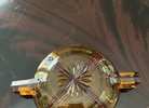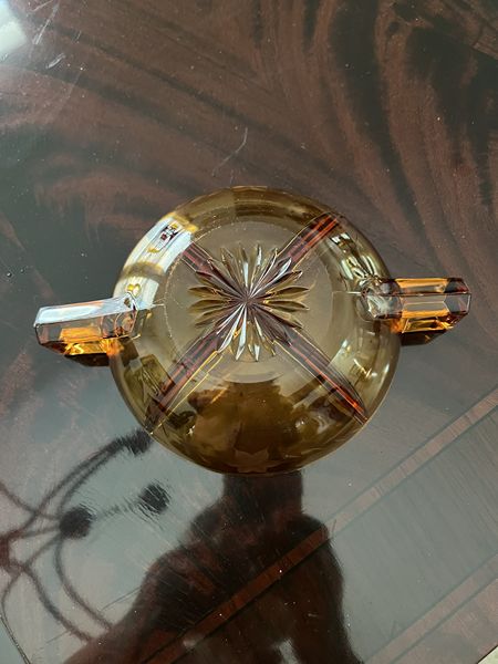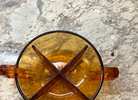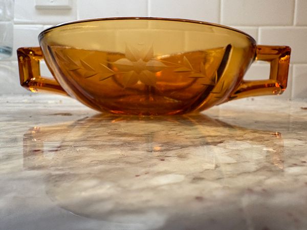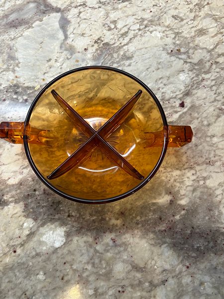 Amber divided glass bowl with floral design and handles. Multi-purpose for serving condiments, nuts, and candy