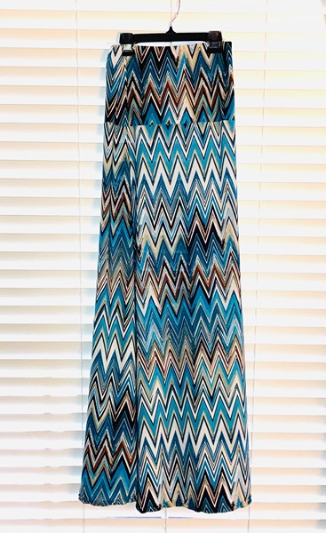 Brand is Win Win, size S-M. Black, white, brown, teal chevron pattern. Can be worn as a skirt or dress (see mannequin pics for example). Has a minor run and snag (pictured), but due to the pattern of the skirt, it's not noticeable. No other known flaws. Smoke free home. $3