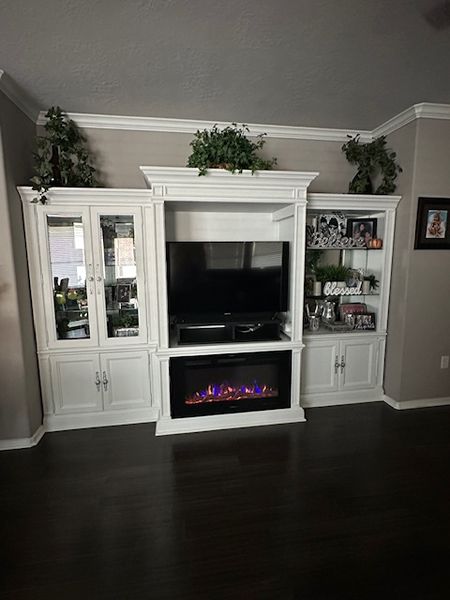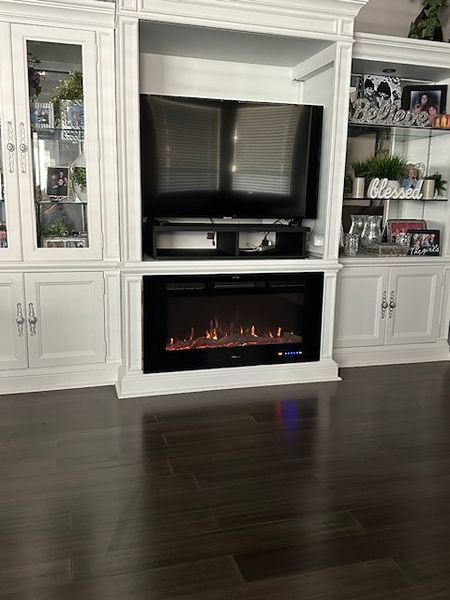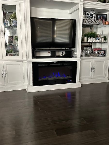 The electric fireplace with heat was purchased in 2020 for $500. There are 3 colors of flame and also comes with stones.
