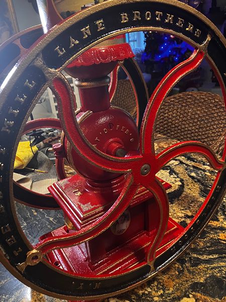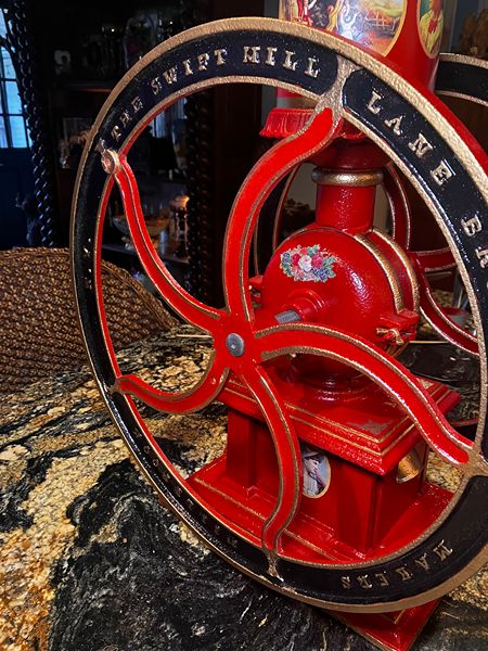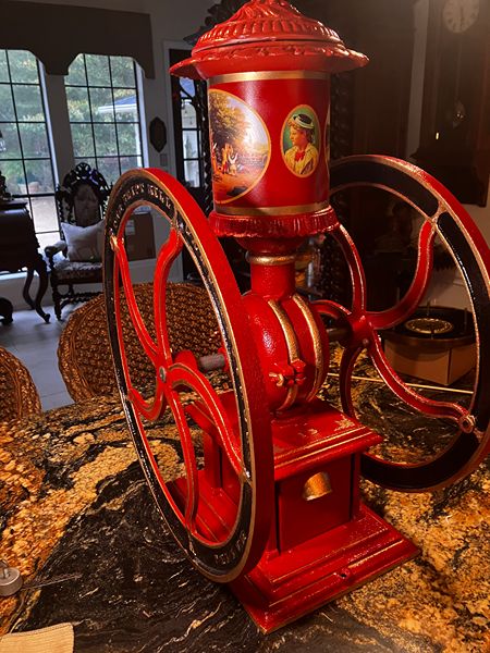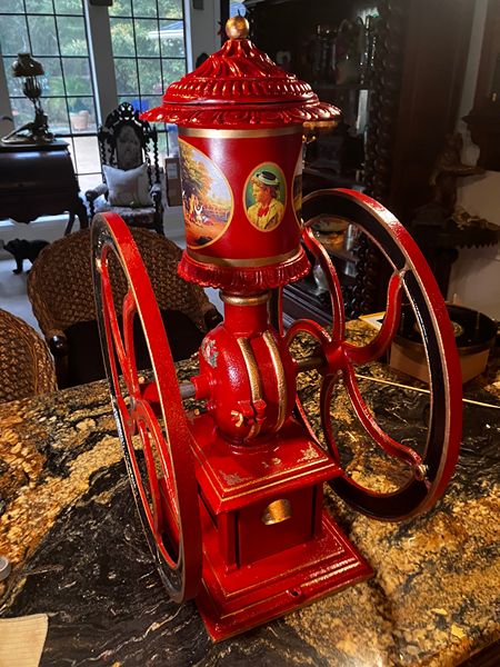 Restored antique Lane Brothers no.15 coffee mill. Completely restored and functions as it should. 30" tall and 13" wide. Last photo is of the finished product.