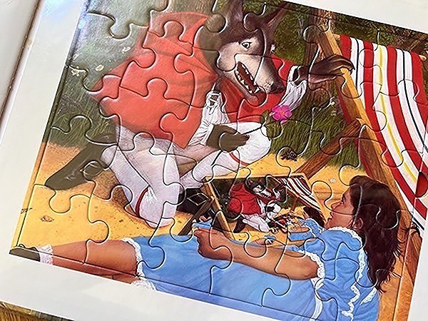 Provides textual clues in rhyme and progessive visual clues in the form of jigsaw puzzle pieces to help the reader determine who is creeping through the woods toward a small figure lying on the beach.