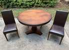 Table is 53" diameter, leaf is 24" x 53", 6 chairs and all chairs match the two in photos. Easy to move as top of table can be removed from base.
