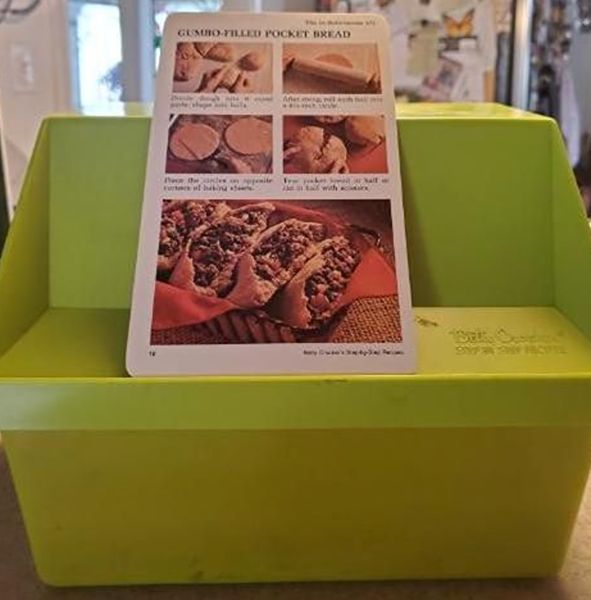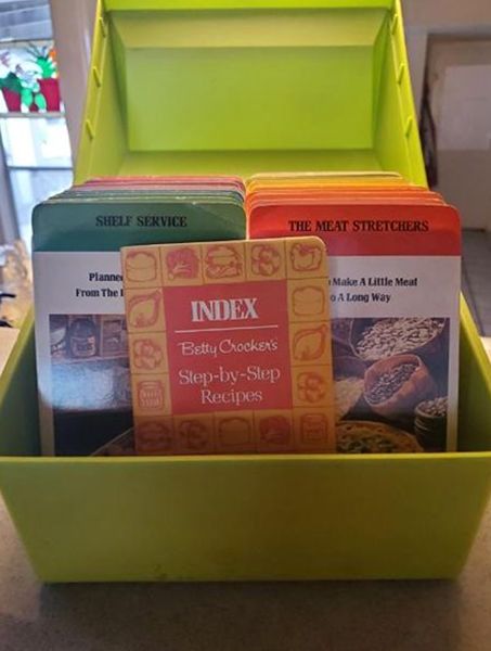 Recipe cards, complete set, 24 categories, laminated Betty Crocker's step-by-step recipe library, 1976 copyright. Over 700 recipes inside! Lime green file box holds all cards and divider cards, index of recipes, as well as being a useful stand for chosen recipe as you cook. Recipe box overall size aprox 10 x 8 x 8.5 inches