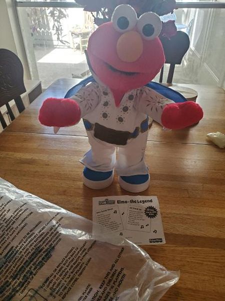 He plays one of two different songs and wiggles when his left hand is squeezed, "Blue Suede Shoes" or "All Shook Up" with an Elmo flair.