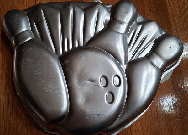Full-sized metal Bowling theme shaped cake pan - Decorating ideas included. 1990 vintage one-mix aluminum pan is 14 1/4 x 11 1/4 x 2 in. Small dent on bowling ball is not noticeable on cooked cake.