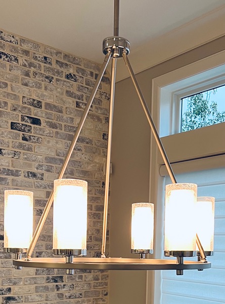 one-tiered, 6-light chandelier is particularly dramatic and will be the highlight of any space
