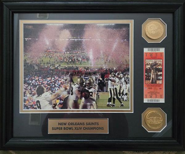 Collect a piece of New Orleans Saints history with this framed super bowl champions photograph, game ticket and two gold championship coins. Framed measures 13x16 and has hanging tab or standing easel for desktop or wall display. Email if interested and I'll reply with pickup details.Cash only please.