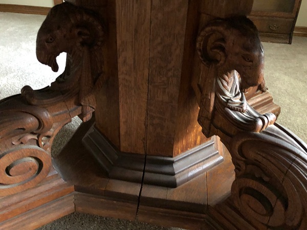 Antique table originally from England. Purchased at an auction in Leavenworth, Kansas in 1975. Base has carved rams heads. 40 inches tall. 54 inches in diameter. Asking $300.00.