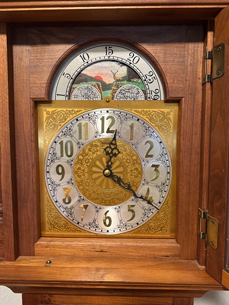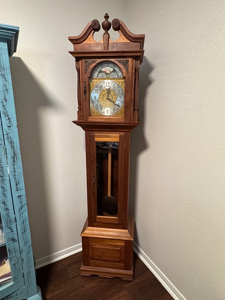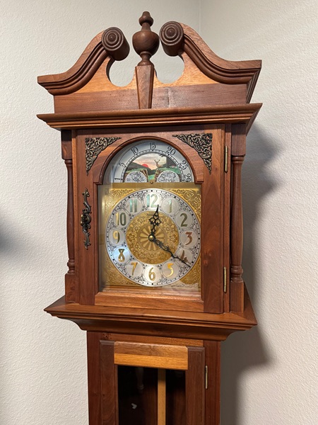 1972 emperor grandfather clock. It has a German timepiece 300 movement, with moon cycle, and solid cherry case. This heirloom clock has been in our family for over half a century.