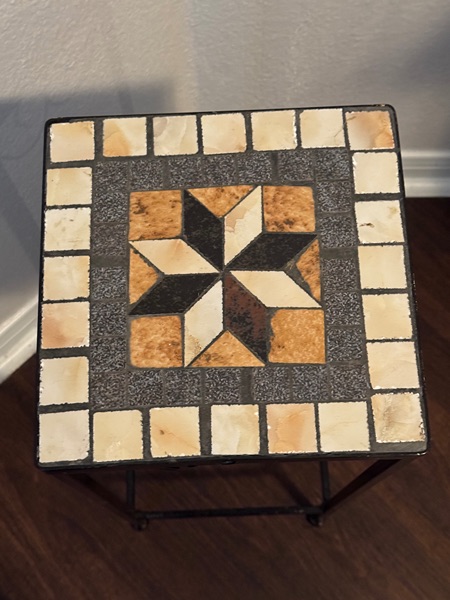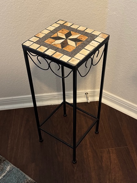 Metal plant stand with decorative mosaic tile top. This lovely tile top accent table/plant stand would make a nice addition to your home.